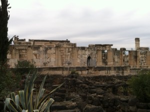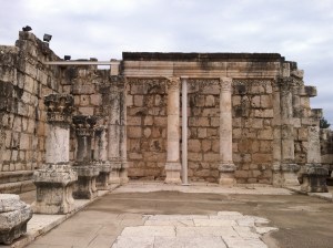 The floor plan would have been about the same – a central court, separated from the side corridors by columns, and long stone benches lining those outer corridors – this was a style of synagogue particular to Galilee, and other synagogues excavated in nearby villages are arranged in this same way. The columns would have supported an upper gallery for the women. They would have reached this gallery by an outside stairway.