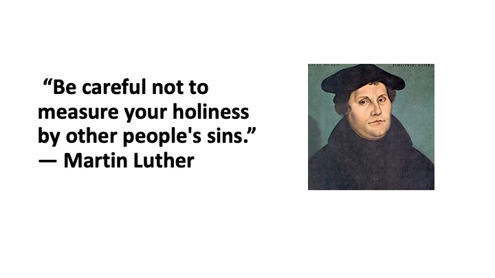 That Martin Luther cuts right to the quick, doesn’t he? Don’t go measuring your own holiness against the sins of others. We do that, though, don’t we? “There but for the grace of God go I,” my mother used to say whenever someone she knew had stepped out of bounds. What she didn’t realize was, every time she said that, we knew she meant the same thing the Pharisee praying loudly in the temple meant – “God, thank you for making me better than everyone else.” (Luke 18:11, my paraphrase)