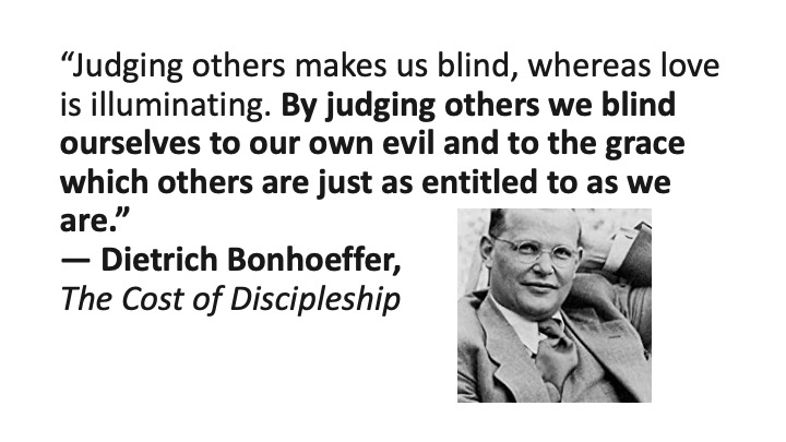 So why on earth, Jesus wonders, would you try to help someone else get a speck of sawdust out of their eye, when you have a whole tree trunk in your own? First of all, God created a mechanism for removing foreign objects from the eye – tears. But more so, you can’t even see the speck well, because your own view is obstructed. Like Bonhoeffer says, By judging others we blind ourselves to our own evil and to the grace which others are just as entitled to as we are.”
